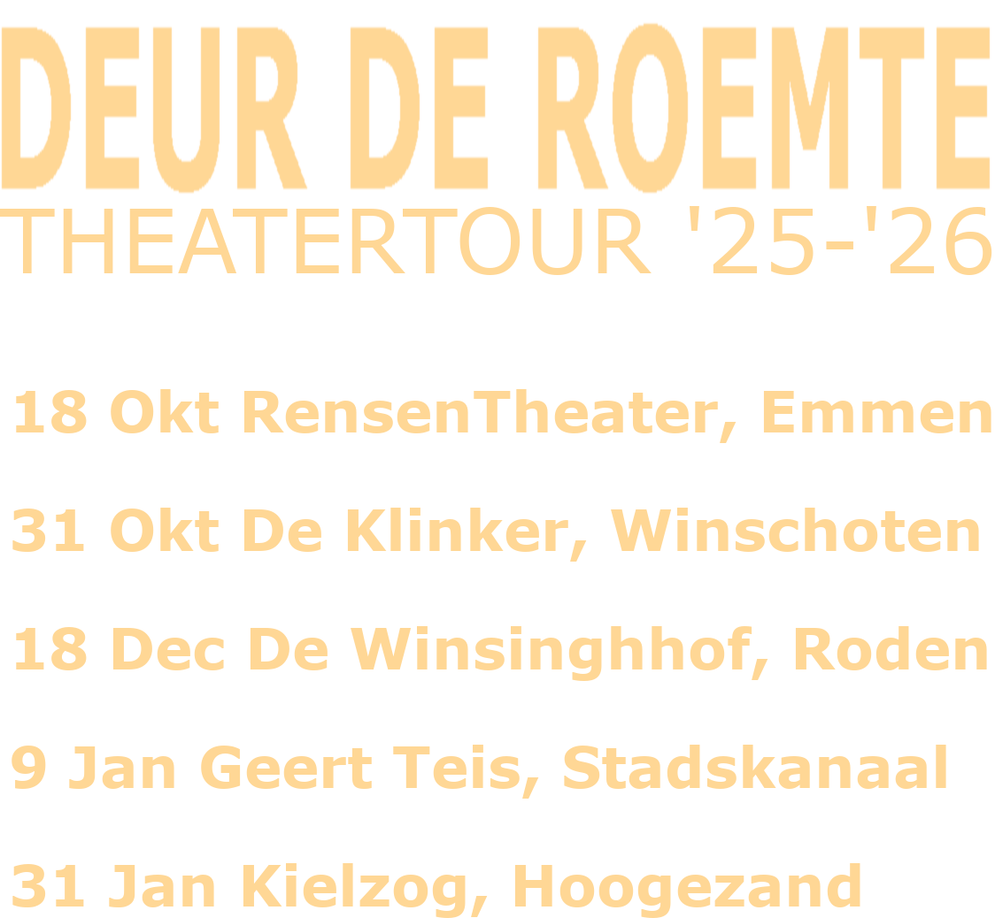 | Vr. 9 jan. | Stadskanaal | Deur de roemte (Stadskanaal) | Geert Teis | INFO & TICKETS |